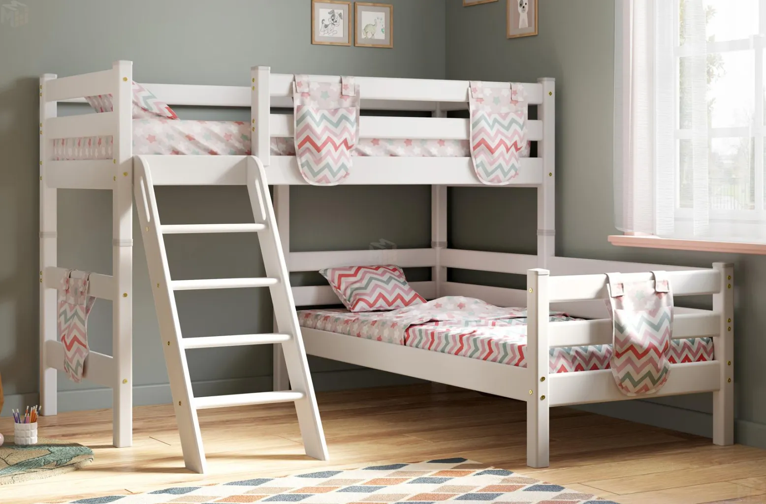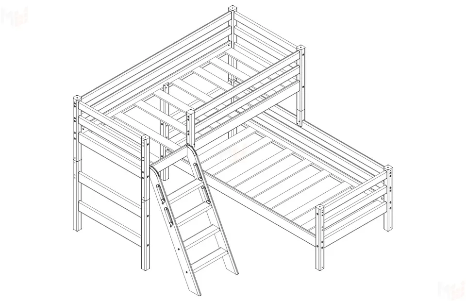 Вариант 8 угловая кровать «Соня» с наклонной лестницей — один из примеров идеального сочетания практичности, оригинальности и долговечности. Цветовое исполнение подходит сразу для нескольких стилей, а габариты — для комнат разной площади. Мебель для детской создается из безопасных материалов с отличной износостойкостью.