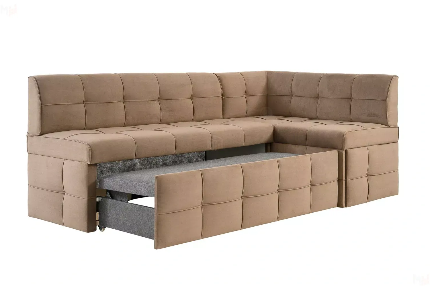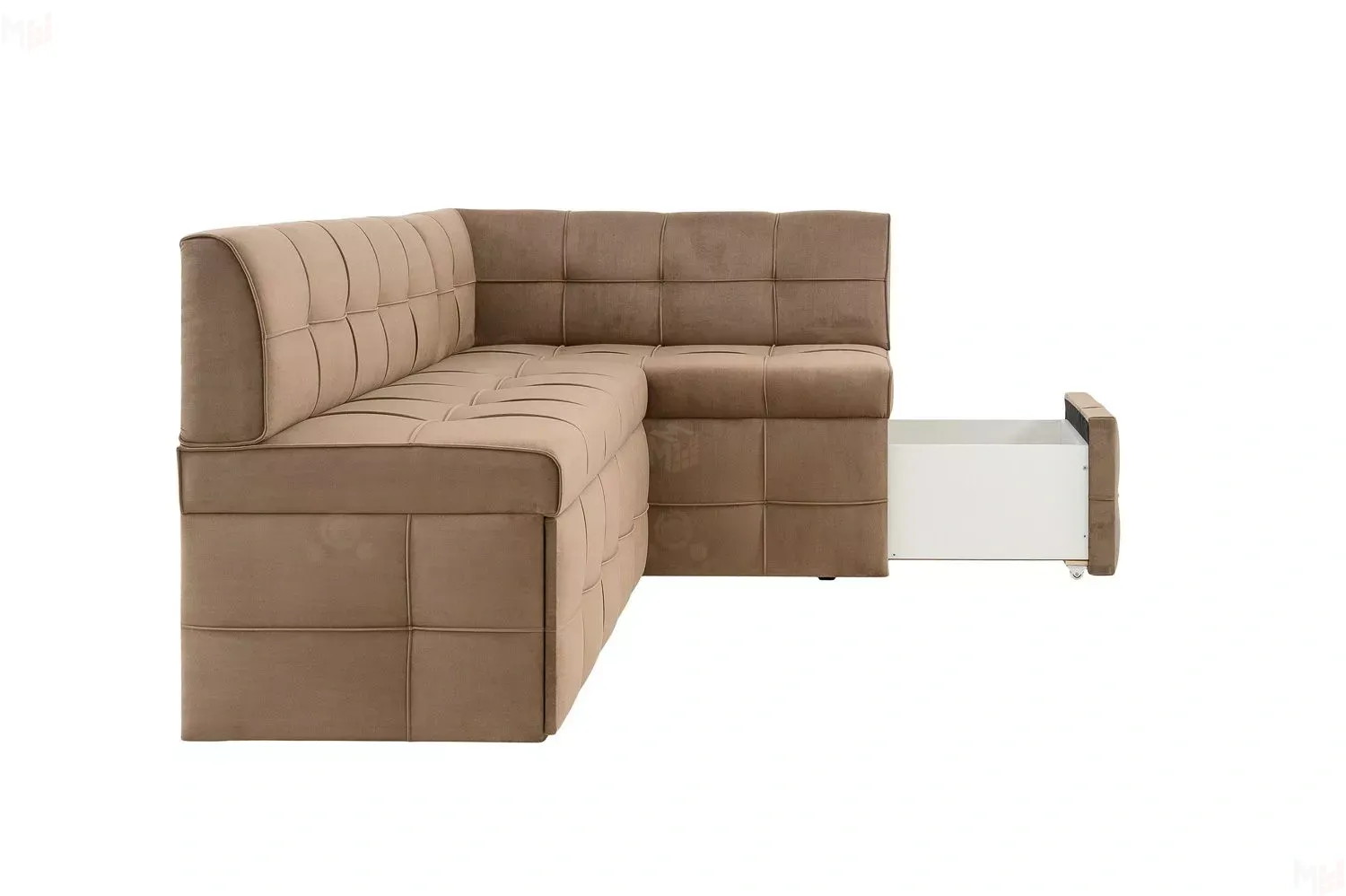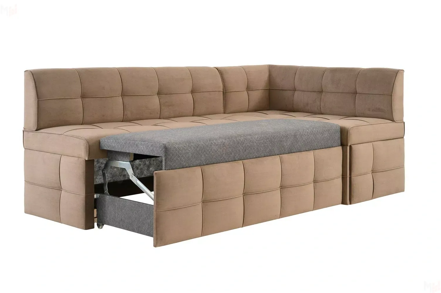 Отсутствие подлокотников позволит сэкономить пространство. Диван изготавливается со спальным местом, механизм трансформации дельфин, при раскладывании создает полноценное гостевое спальное место или с большим выкатным ящиком под сиденьем. В угловой части имеется вместительный ящик для хранения кухонной утвари или спальных принадлежностей. Будет отлично смотреться в мягком ворсовом велюре или рогожке. Изготавливается с шагом каждые 10 см в размере от 162х105 до 202х185 см.