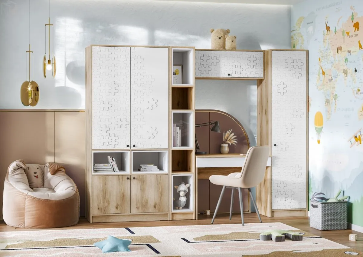 Уголок школьника Киви состоит из нескольких модулей, которые обеспечат удобство и функциональность для детской комнаты. Материал изготовления - ЛДСП, МДФ, что обеспечивает прочность и надежность конструкции. Цветовое решение комплекта включает в себя комбинацию дуба делано, белого и супермат белого, что создает свежий и стильный дизайн.