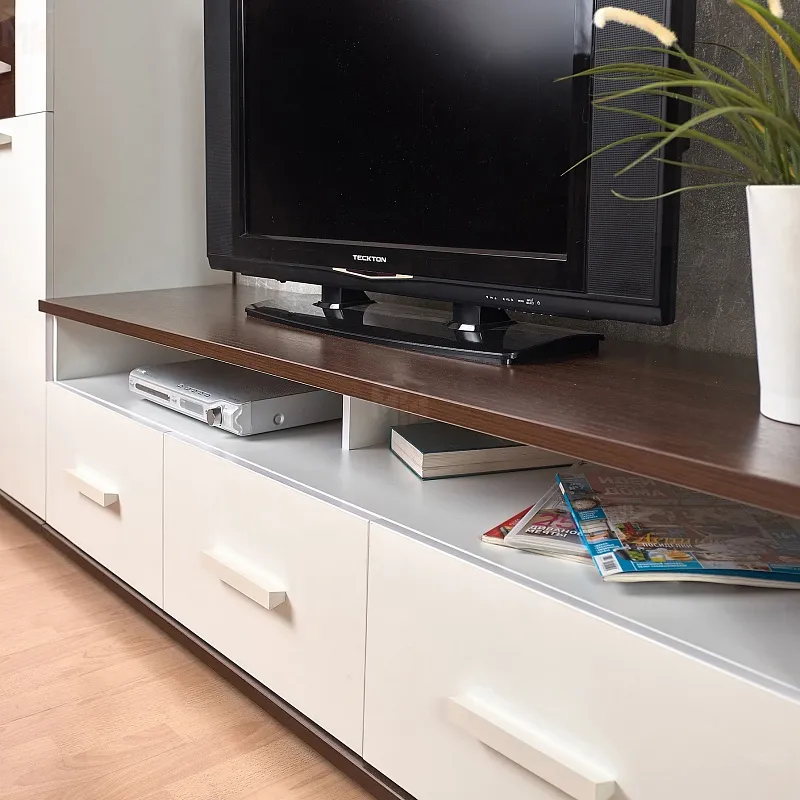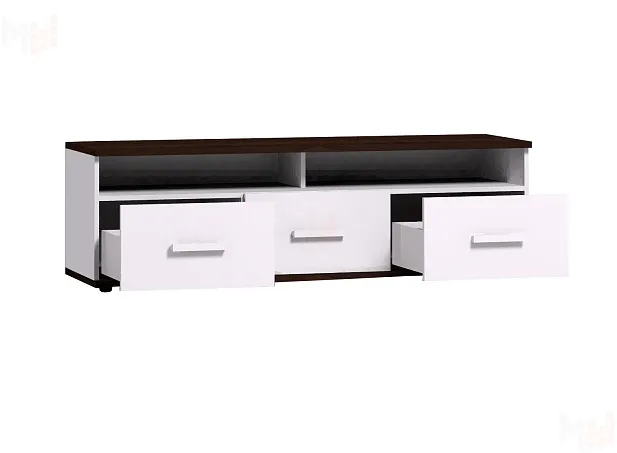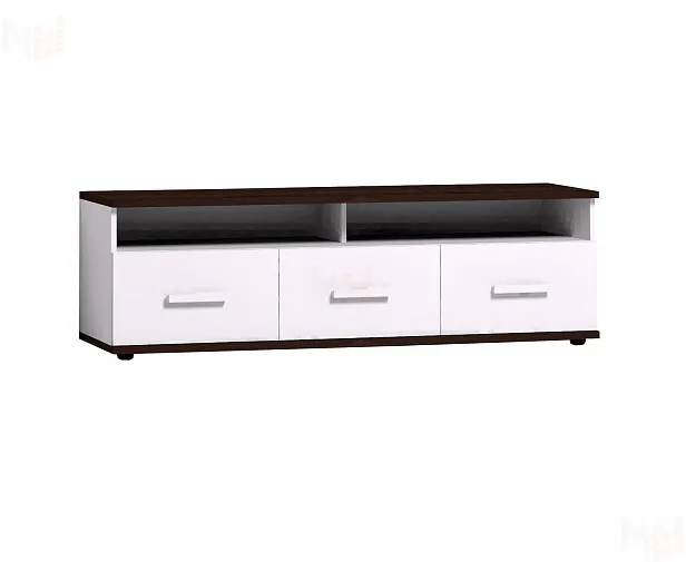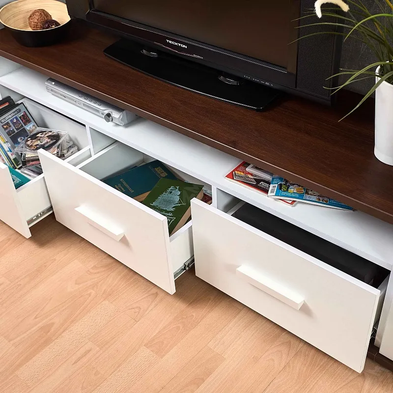 Тумба ТВ Норвуд 3 Тумба ТВ в белом минималистичном дизайне гармонично дополнит любую современную гостиную. Яркий акцент тумбы - контрастные верх и низ толщиной 22 мм в декоре Орех шоколадный. Три выдвижных ящика на шариковых направляющих плавно и бесшумно открываются за светлые ручки из массива дерева. Утопленная вглубь перегородка открытой ниши создает ощущение легкости и воздушности. На невысокой тумбе можно разместить телевизор диагональю до 65''.