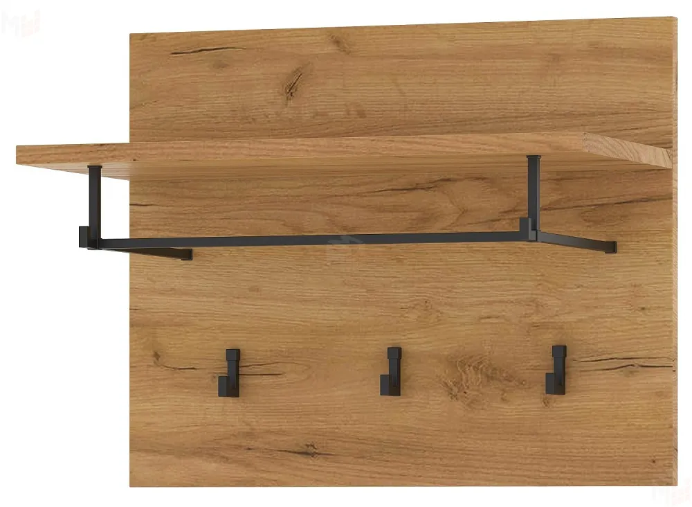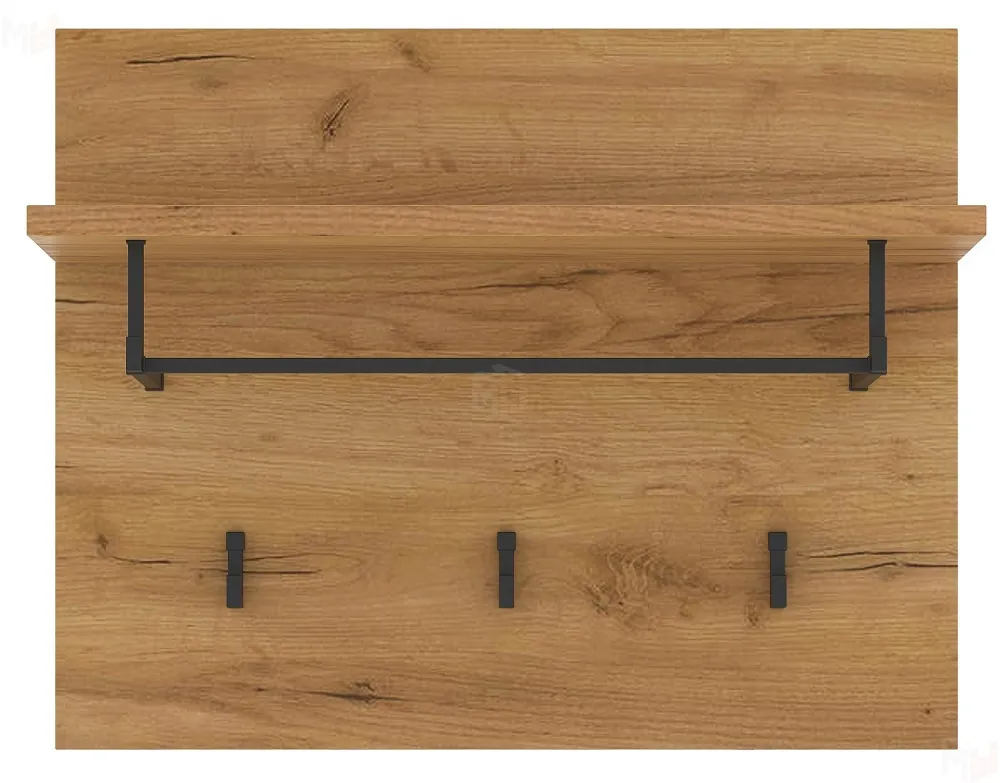 Вешалка 500 ГРЕТТА с полкой навесная. Чёрные матовые металлические крючки и опора полки. Крепится к стене через навесные элементы.