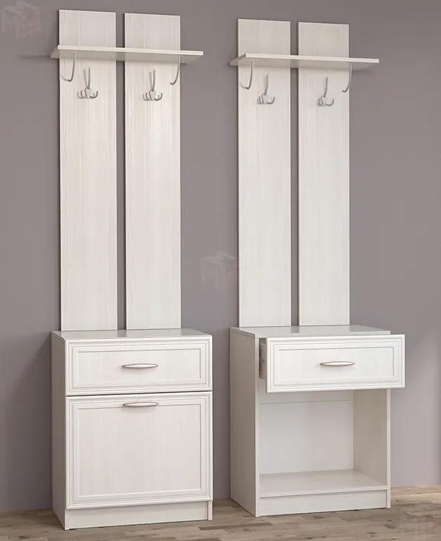 Мини прихожая включает в себя тумбу для обуви с выдвижным ящиком и откидной дверкой, вешалку с двумя двойными крючками и антресольной полкой.