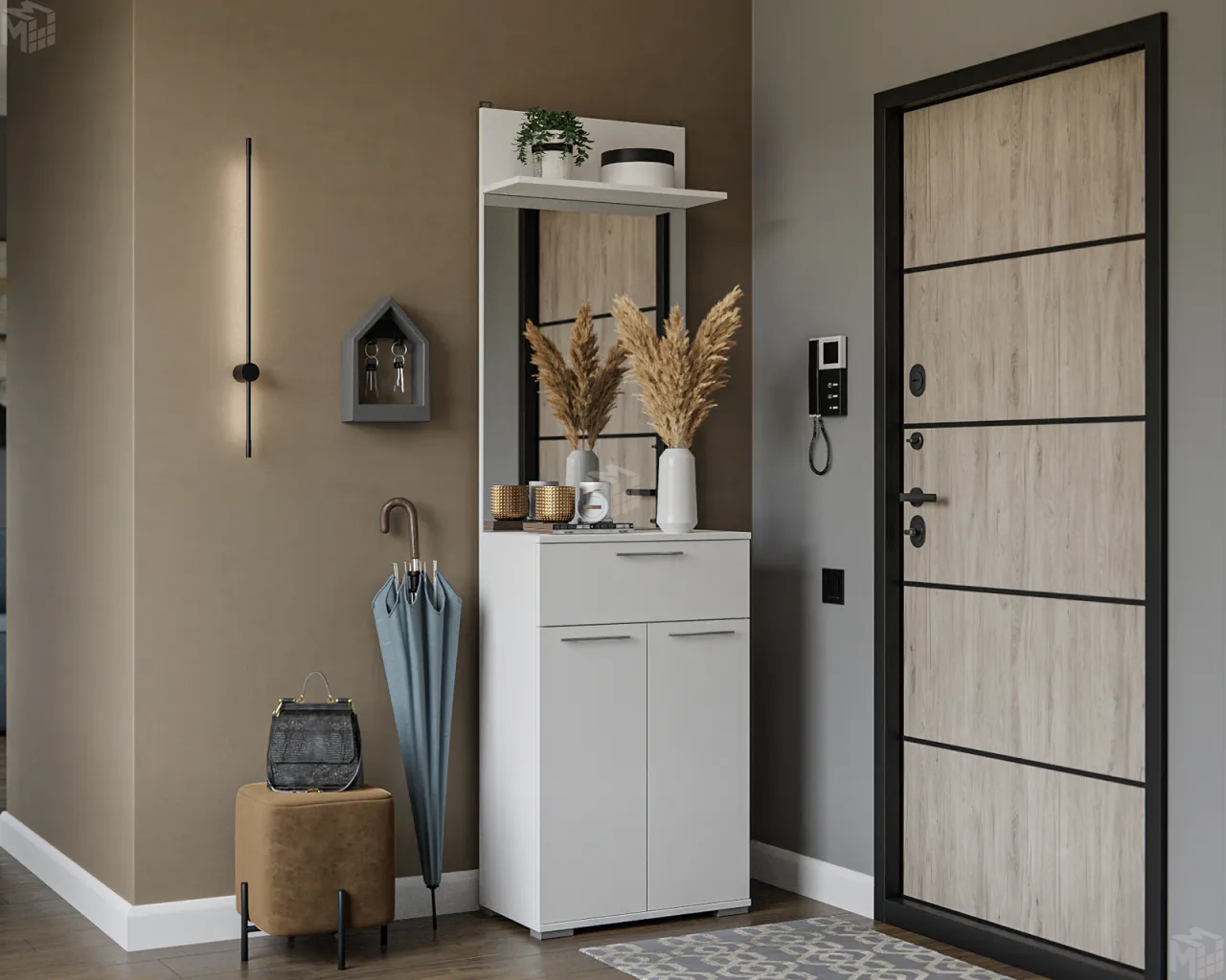 Выдвижным ящиком для удобного хранения хозяйственной мелочи и различных аксессуаров, например, зонтов, перчаток, сумок, головных уборов.